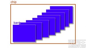 一个chip就是一个闪存颗粒,就是一个芯片。一个chip中包含多组bank,一个bank就是一组单元阵列。